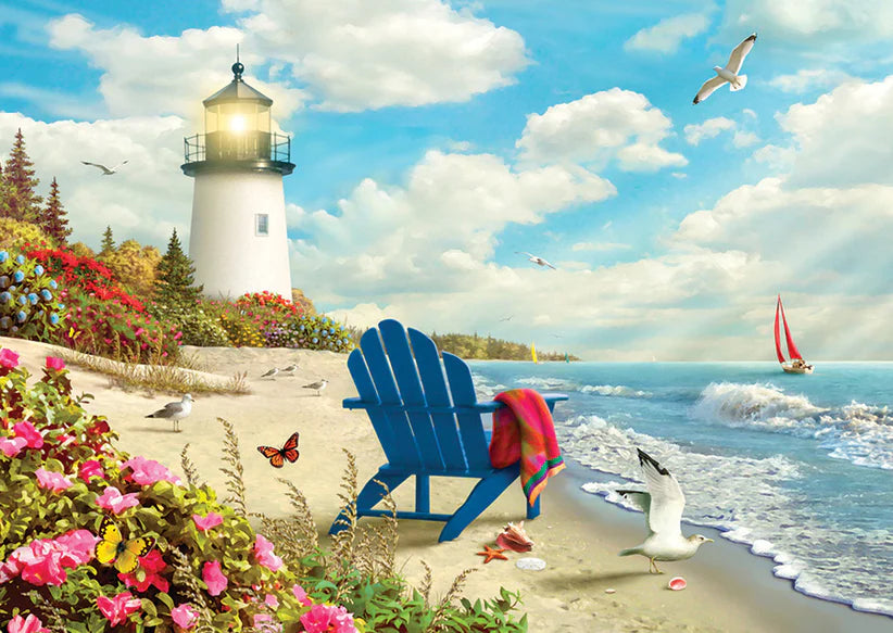 The gentle rhythm of the ocean calls you to unwind in a welcoming blue Adirondack chair, where sailboats drift lazily in the warm breeze beneath a brilliant blue sky. With the lighthouse keeper enjoying a quiet day, the sunshine brings butterflies and birds to dance among the vibrant flowers, completing this peaceful and picturesque coastal escape.