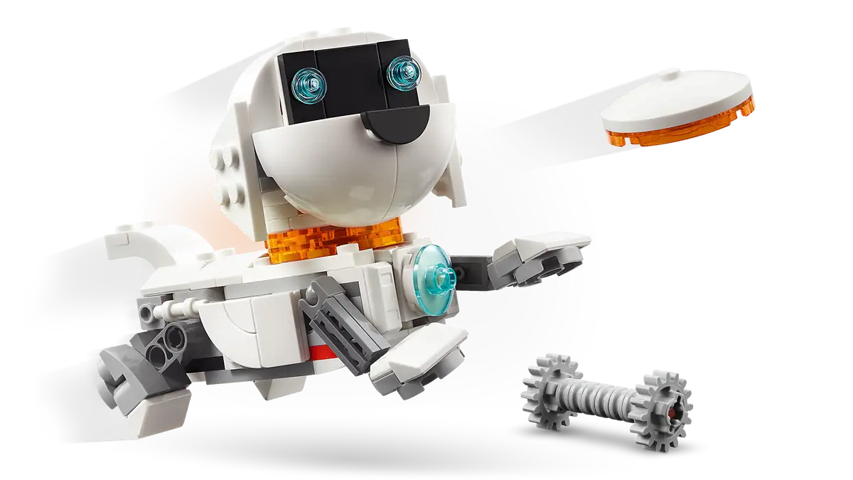 LEGO fans build and rebuild 3 different action-packed space playsets with the same bricks: a robot toy on moving tracks; a posable space dog figure with a bone and a flying disc; or a space rocket. All 3 models are cool space-themed gifts for play and display and illuminate when kids press down on a light brick (batteries included).